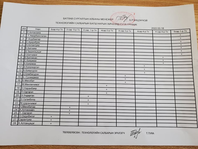 2022.03.21-ээс салбарын багш нарын хичээлд сууж, зөвлөгөө өгөх хуваарь гаргалаа.